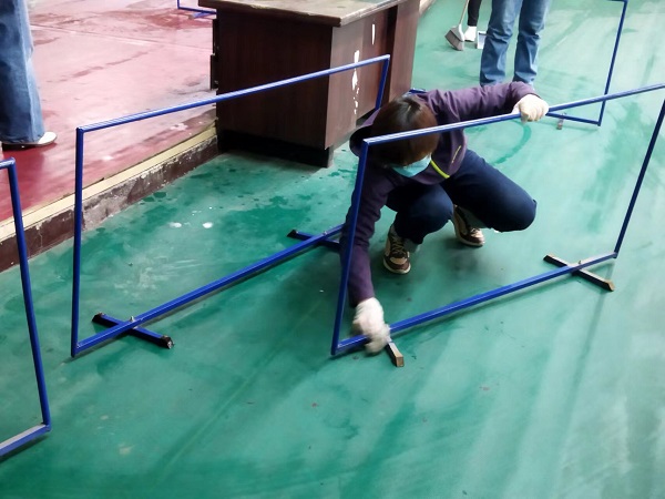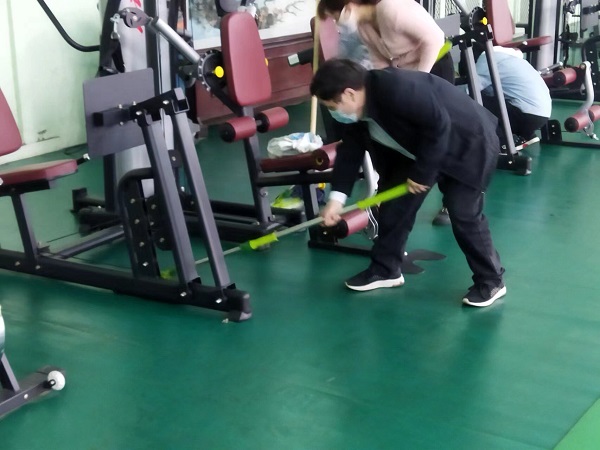 参与活动的20余名同志,分工合作,虽然大家来自不同部门、不同岗位,但争先恐后、合作默契,清理地面、擦拭健身器材、清洁桌凳。“前面的男同志们加油了,我们快赶上你们了!”负责拖地的九分公司主任经济师刘彩在后面说道。“这个乒乓球挡布拿抹布擦拭的效果不太好,用外面的高压水枪冲洗试试吧!”九分公司主任会计师付世芳一边用抹布擦拭挡布一边提出自己的合理化建议,“这个办法好!”九分公司综合办公室主任张路平同意道。