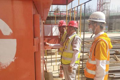 近日,大风大雨频频光顾现场给塔吊运行带来安全隐患,项目部迅速组织专项检查,对塔吊螺栓、塔身垂直度、基础是否积水进行认真检查与测量,发现问题马上采取措施。频繁的降雨对现场临电安全是个巨大考验,项目部加大对现场临时用电设备的检查力度,用电设备接零、接地严格按照规范要求进行操作,电缆线路一律采用PVC管保护,避免泡水或磨损造成漏电事故。生产经理、安全员、水电工长每天对现场电源线路、漏电保护器灵敏度、配电箱进行仔细检查,确保临电线路和用电设备安全。