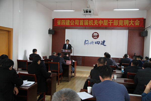 公开竞聘选贤才,四建才俊展风采。2021年2月24日,省四建公司首届机关中层正职岗位竞聘会在四楼培训中心举行。30人(次)英才跨上讲台,畅谈自己对11个中层正职岗位的履职目标和创新举措,为公司各部门的管理献计献策。这是公司成立以来首次机制改革大规模人才选拔考评活动。公司党委书记董事长董富强发表开赛致辞和总结讲话。公司党委副书记、纪委书记、工会主席李怀生主持竞聘大会。